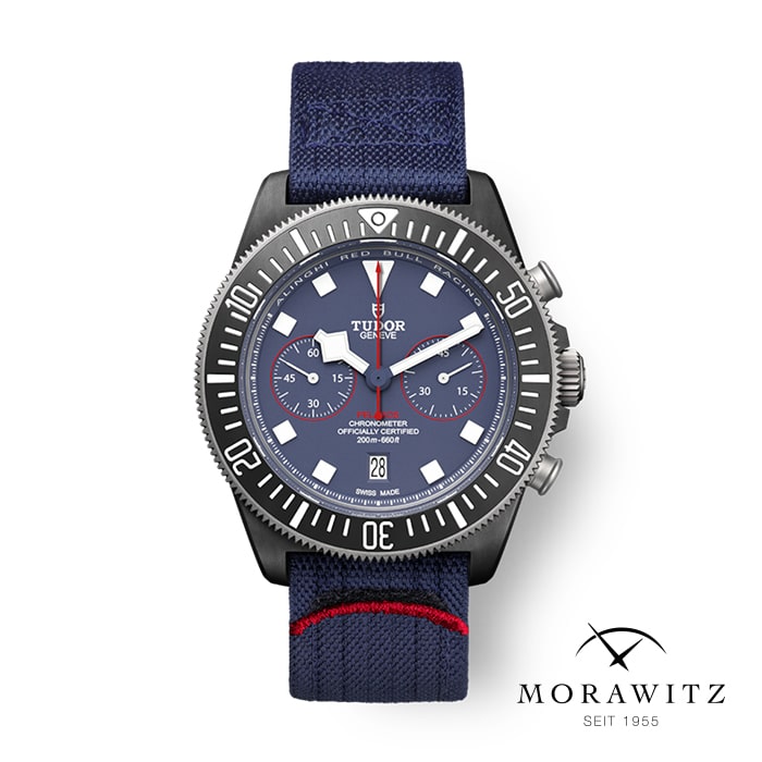 Die Tudor Pelagos FXD Chrono M25807KN-0001 zeichnet sich durch eine ausgeprägte Funktionalität und robuste Ästhetik aus, die speziell für den Segelsport und maritime Abenteuer entwickelt wurde. Dieses Modell besitzt ein 43 mm großes Gehäuse aus Carbon mit mattschwarzem Finish, das nicht nur leicht und widerstandsfähig ist, sondern auch das gravierte Alinghi Red Bull Racing-Logo auf dem Gehäuseboden trägt, ein Zeichen für seine exklusive Partnerschaft und Leistungsstärke.