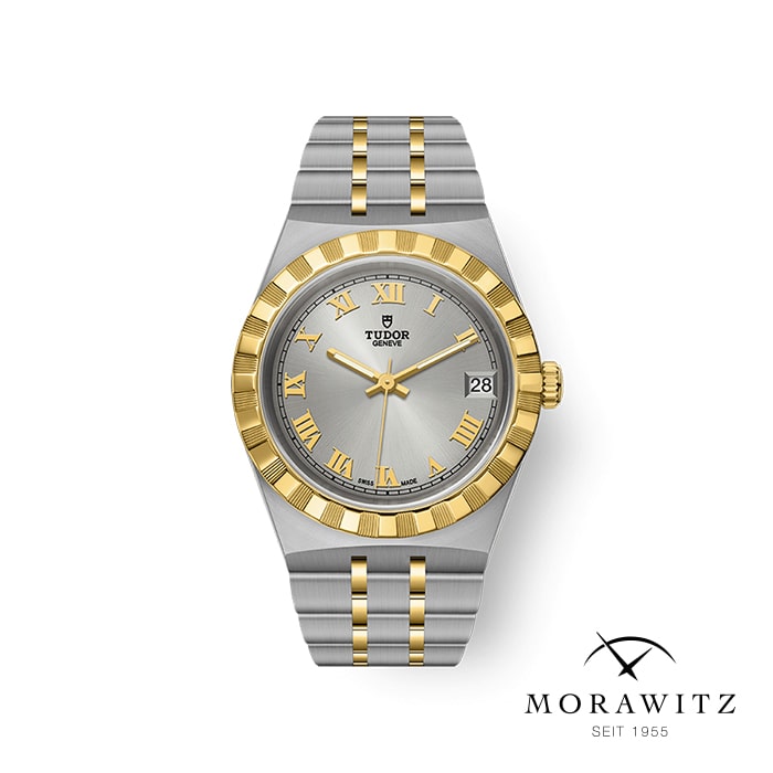 Die TUDOR Royal besticht durch ihr beeindruckendes 34-mm-Edelstahlgehäuse, das robustheit und Langlebigkeit gewährleistet. Zusammen mit einem elegant verarbeiteten Armband aus Edelstahl und Gelbgold hebt sich diese Uhr nicht nur durch ihre Optik ab sondern auch durch ihren hohen Tragekomfort. Die gekerbte Lünette fügt dem Ganzen eine spielerisch-signifikante Note hinzu, während das silberne Zifferblatt mit Sonnenschliff tiefgründiger Glanz ausstrahlt.
