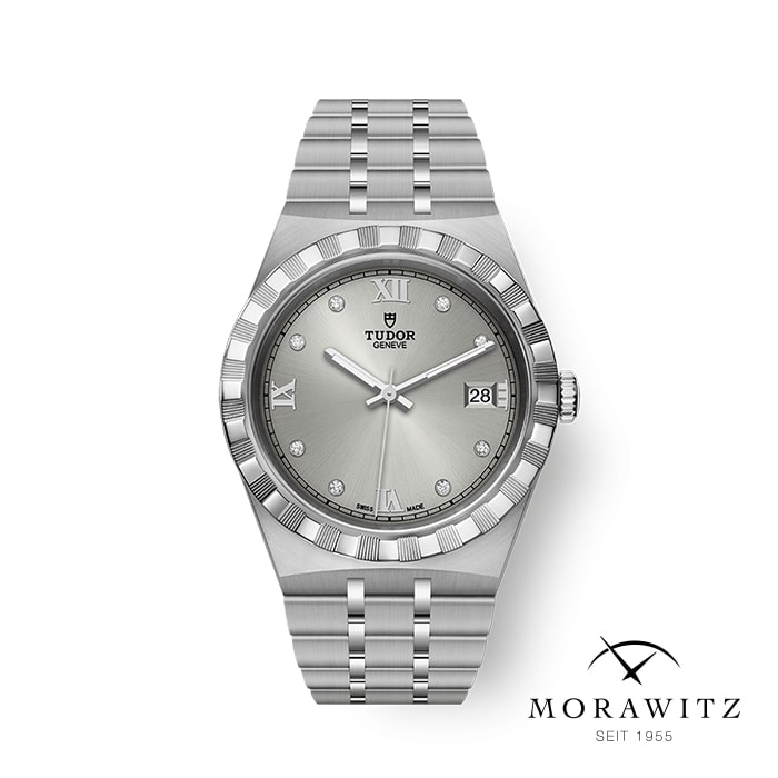 Entdecken Sie den eleganten Zeitmesser – TUDOR Royal. Eine Uhr, die Tradition und Moderne in perfekter Harmonie vereint. Der markante Durchmesser von 38 Millimetern fügt sich nahtlos an jedes Handgelenk, während das silberne Zifferblatt mit Sonnenschliff und funkelnden Diamanten pure Eleganz ausstrahlt. Jedes Detail reflektiert höchste handwerkliche Kunst.