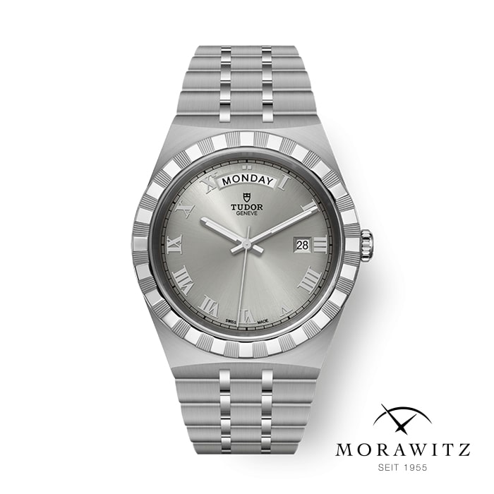 Erleben Sie königliche Eleganz mit der TUDOR Royal – eine Uhr, die sowohl Stil als auch Funktionalität meisterhaft vereint. Diese exklusive Kollektion spiegelt durch ihr raffiniertes silbernes Zifferblatt mit Sonnenschliff und die gekerbte Lünette wahre Handwerkskunst wider. Der Durchmesser von 41 mm garantiert eine präsente, aber dennoch elegante Wirkung am Handgelenk.